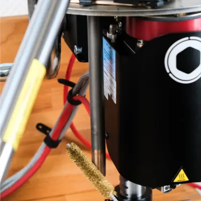 To guarantee the equipment’s longevity and process safety, this model requires the joint use of an industrial water chiller (equipped with a compressor, a minimum flow rate of 13L/min, and a cooling capacity of 1200 Kcal/h). This cooling control maintains regular work rates while protecting the machine’s critical components.