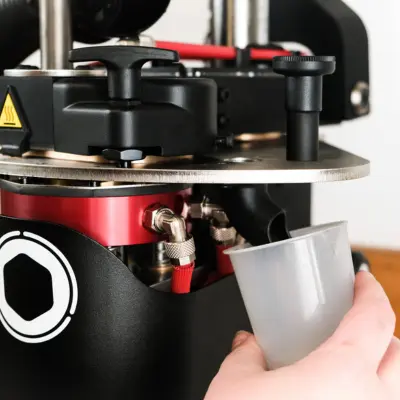 La HoliPress High Temp a été développée pour offrir une stabilité thermique constante et de la fiabilité lors de chaque injection. Pour garantir la pérennité de l’équipement et la sécurité du processus, ce modèle nécessite l’utilisation conjointe d’un refroidisseur d’eau industriel (doté d’un compresseur, d’un débit minimal de 13L/min et d’une capacité de réfrigération de 1200 Kcal/h). Cette maîtrise du refroidissement permet de maintenir des cadences de travail régulières tout en protégeant les composants critiques de la machine.